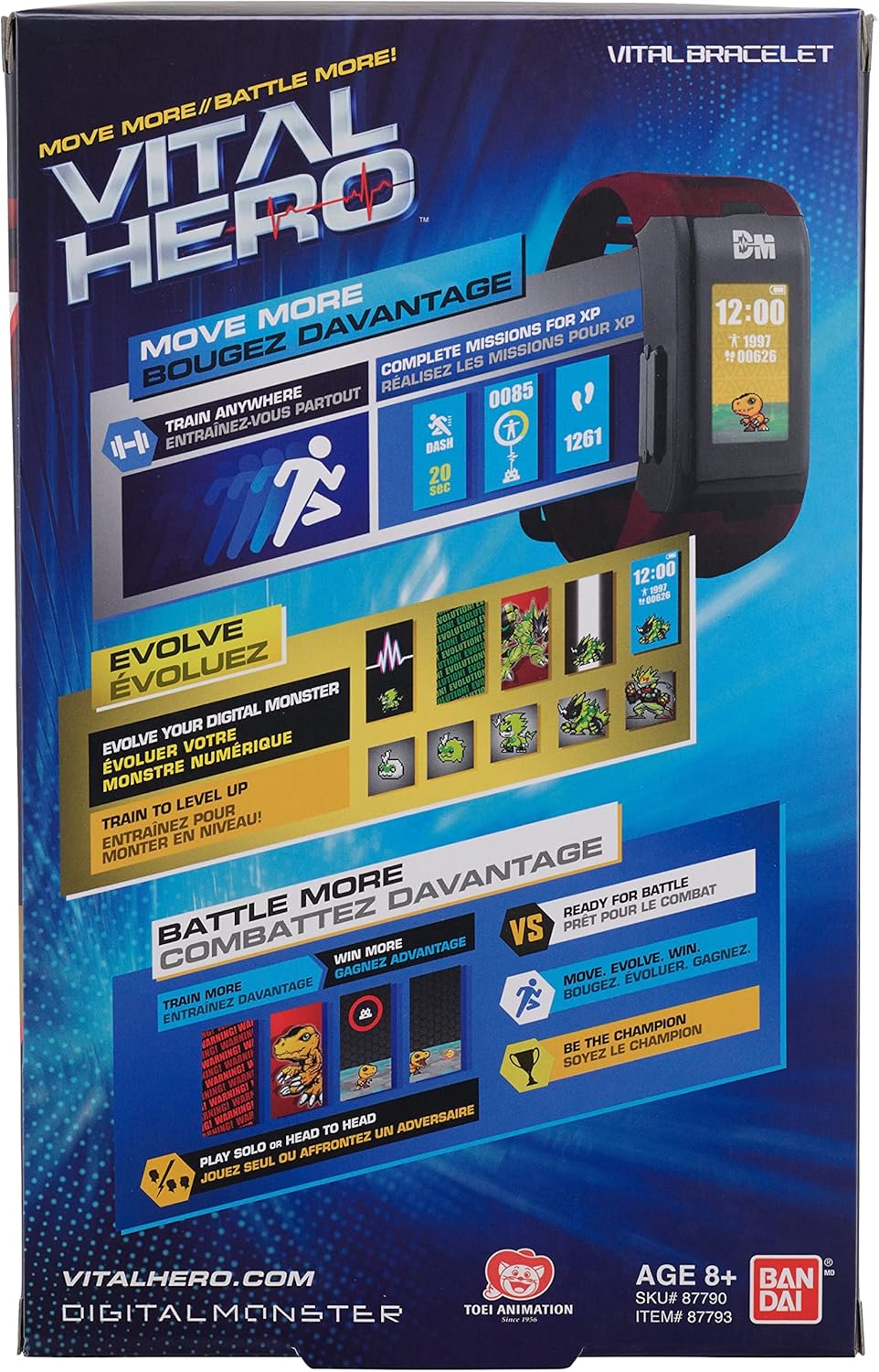 The first interactive wearable Gamified Band that lets you level up and battle with a Digital Monster! Complete easy to hard Activity Missions such as sprinting, shadow boxing, sit ups/crunches, and walking a certain number of steps to earn trophies, increase your battle win rate, and evolve your character. Battles are prompted automatically after training missions are completed or if you tap your band against any NFC reader (Tap to Pay, Phones, etc.). Each Digital Monster evolution will be different, no two people will get the same evolution at the same time. Move More, Battle More.