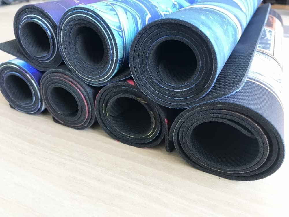 Product Description Size: about 600*350(23.62x13.78 inches) Thickness: about 1.5-2mm. Due to different production batches, the thickness will vary slightly. But the printing quality is very good. Material: High quality natural rubber+ fabric Package include: 1x mat +1x free bag Features: 1. It can be used as a playmat for card game mat, mouse pad, keyboard pad, and work mat. 2. It can be rolled or folded to fit in backpacks or just simply hand-carried. 3. It can be washed. But please do not use the machine to wash it.