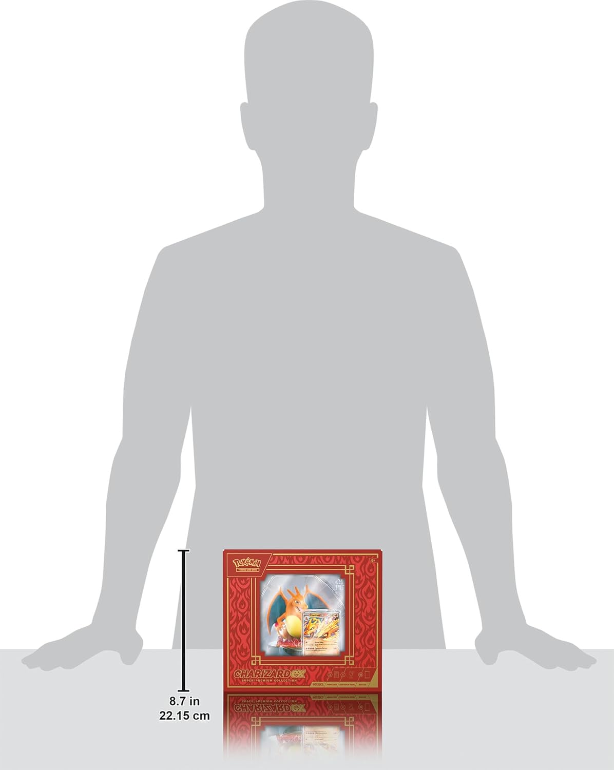 Charizard Guards Your Favorite Card! With explosive attacks and huge HP, Charizard ex has a commanding presence on the battlefield! Bring that burning tenacity to life on your desk, bookcase, or nightstand with an awesome Charizard figure featuring translucent fire effects to show off a favorite card—like the foil Charmander, Charmeleon, or Charizard ex you also get in this collection! Even more fun awaits in a stack of 10 booster packs from different Pokémon TCG expansions.