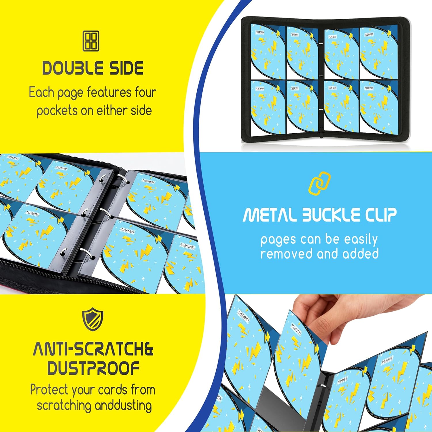 - ⚡【400Extra-Large Capacity】This trading card binder features 50 thickened card pages, each with a double-sided card pocket design that easily holds up to 400 cards. The removable 3-ring structure allows flexible addition or removal of pages, giving you complete control over capacity. Perfectly suited for every stage of your collecting journey, ensuring every card has its own dedicated display space.