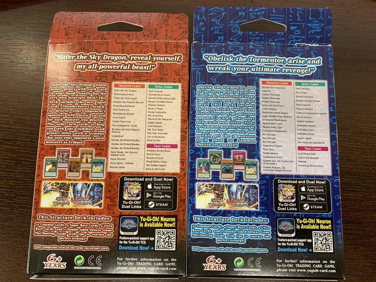 Obelisk the TormentorUnleash the true power of Obelisk the Tormentor by Tributing 2 monsters you control and wipe your opponent’s monsters off the field! This Deck uses self-replicating monsters to provide Tributes and protect your Life Points as you get closer to drawing your Divine Beast. Obelisk’s own ability can crush your opponent’s monsters all at once, but throw in the new Spell Card, Fist of Fate, and you can negate a monster’s effect and destroy it without needing to Tribute. Activate during your own Main Phase and you can crush all your opponent’s Spells and Traps as well!Each Egyptian God Deck is 40 cards total and includes 1 Egyptian God Card and 5 new cards – 4 unique new cards as well as 1 copy of Soul Crossing, a brand-new Quick-Play Spell Card included in both Decks that lets you Tribute Summon your Egyptian God Card by Tributing your opponent’s monsters!Each Deck is playable on its own straight out of the box and comes with a Dueling Guide that explains the basic strategy and some rules you should know to get the most out of your Deck. Of course, if you pick up both, you can mix and match their strategies to create an awesome Deck that can wield multiple Egyptian God Cards!